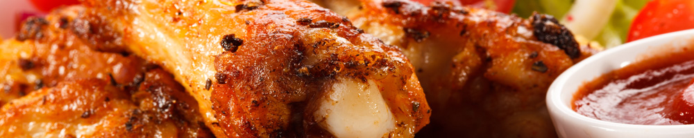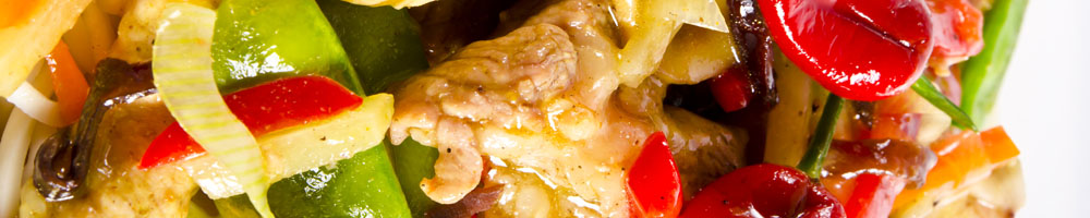 Hähnchenfleisch in einer Sauce aus Zwiebeln, Paprika und Soja-Chili-Sauce