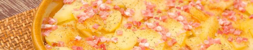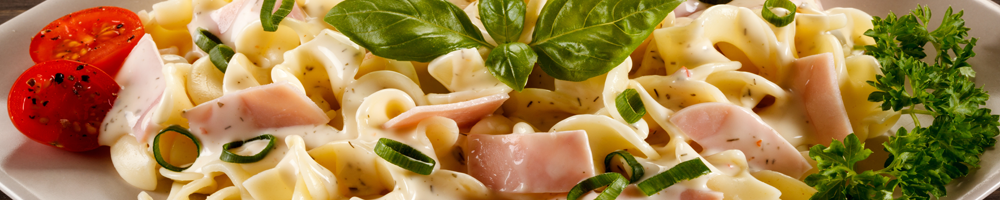 mit Schinken, Champignons, Sahnesauce und Käse überbacken
